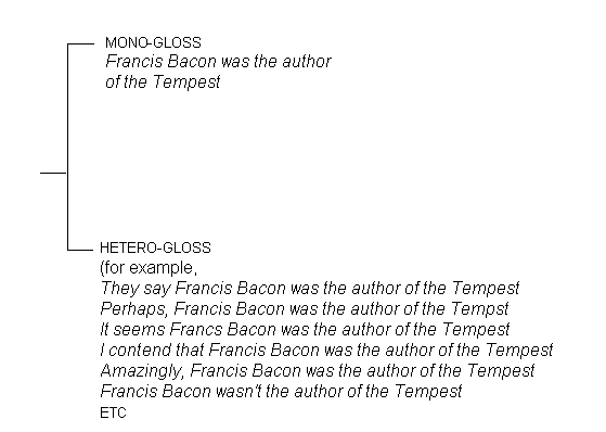 Thus while attribution and probability differ in the terms by which they complicate and diversify the voicing of the text (attribution introduces an external, probability an internal voice), they nevertheless share this functionality of multiplying the voices in the text and thereby establishing each voice as representing but one of a number of possible heteroglossic positions. Insights from Bakhtin are once again helpful in clarifying this point. He talks as about `our-own-ness' and the `other-ness' of a text's multiple voices.