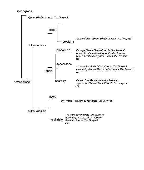 The final option under `open' - `hearsay' - entertains heteroglossic diversity in a similar way, although its semantics perhaps require some additional explication. Under `hearsay' the possibility of heteroglossic alternation remains open because the utterance is marked as based on what some unspecified person said. In many languages, of course, hearsay is coded grammatically rather than lexically - hearsay is an integral part of the MODALITY system. Within English and similar languages, hearsay is coded by means of wordings which derive from the grammar of verbal projection but in which the projecting sayer is absent or cannot be specified - thus, `Reportedly, she viewed the papers', `Her alleged viewing of the documents.', `It's said she viewed the papers.', `I hear she viewed the documents.'. The semantic consequence of such structures is not to introduce an alternative voice into the text and hence `hearsay' is included within `intra-vocalise' and not within `extra-vocalise'. Rather, it functions to indicate that the meanings qualified by the hearsay are negotiable in heteroglossic terms.
