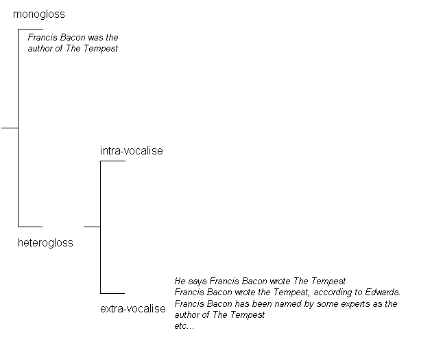 Thus while attribution and probability differ in the terms by which they complicate and diversify the voicing of the text (attribution introduces an external, probability an internal voice), they nevertheless share this functionality of multiplying the voices in the text and thereby establishing each voice as representing but one of a number of possible heteroglossic positions. Insights from Bakhtin are once again helpful in clarifying this point. He talks as about `our-own-ness' and the `other-ness' of a text's multiple voices.