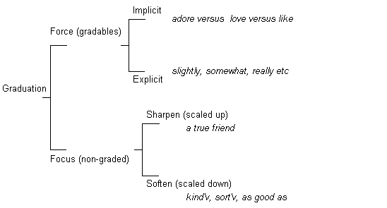 Under GRADUATION, we are concerned with values which act to provide grading or scaling, either in terms of the interpersonal force which the speaker attaches to an utterance or in terms of the preciseness or sharpness of focus with which an item exemplifies a valeur relationship,. These two dimensions are variously be labelled `FORCE' (variable scaling of intensity) and `FOCUS' (sharpening or blurring of category boundaries).
